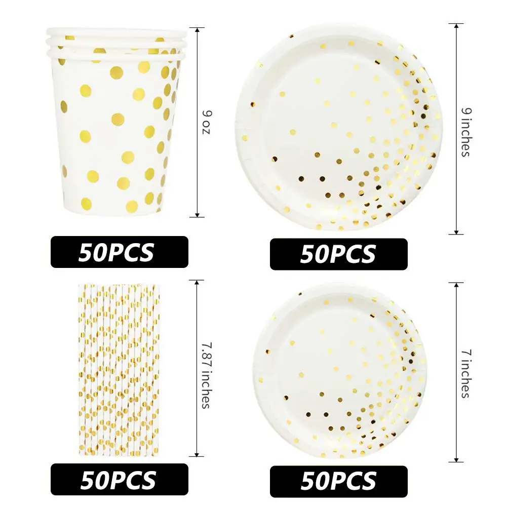 Hot Sale 250 pcs Disposable Dinnerware Gold Dot Disposable Cups Plates Straws Set for Graduation Birthday We