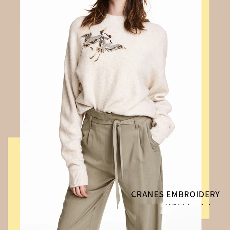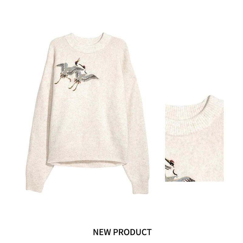 YNZZU Crane Embroidery Beige Knitted Sweater Women 2019 Autumn Winter Casual Long Sleeve Loose Knit