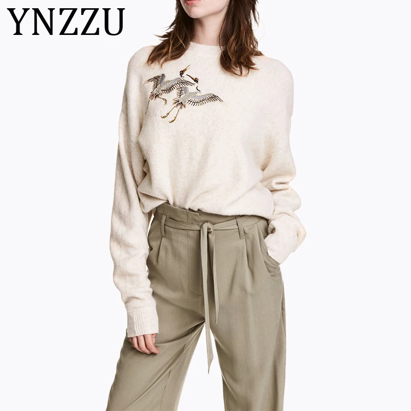 TOP YNZZU Crane Embroidery Beige Knitted Sweater Women 2019 Autumn Winter Casual Long Sleeve Loose Knit