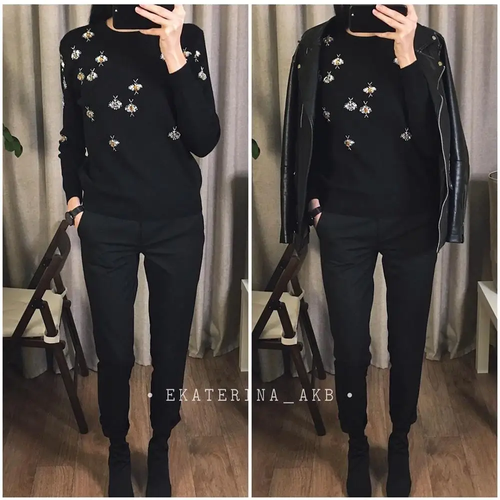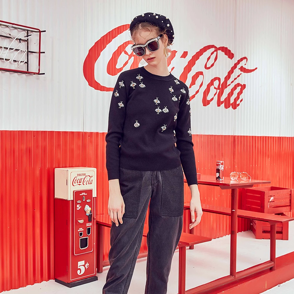 2019 Luxury Brand Autumn Winter Black Sweaters Pullovers Knitted Women Christmas Runway Bee Diamond