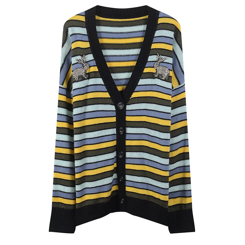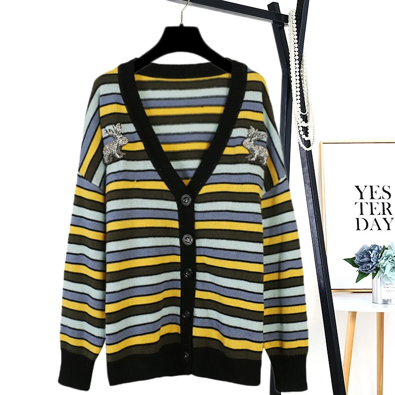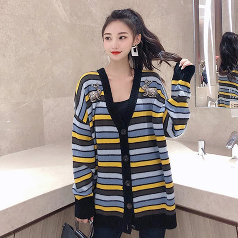 Tunjuefs Loose Color Block Striped Cardigan Women Sweater Coat Rhinestones Beading Animal Maxi Long