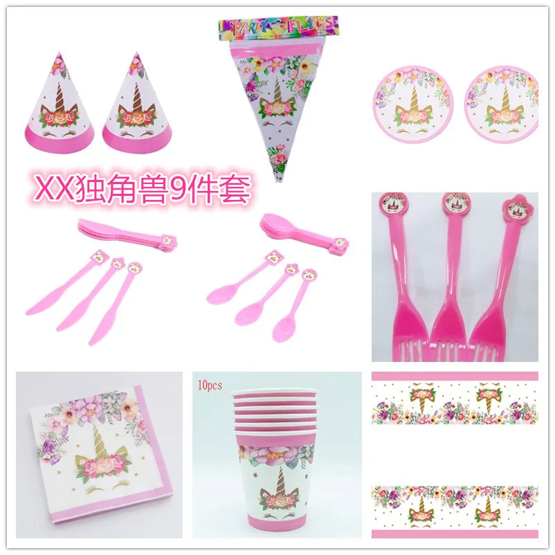 2019XX unicorn pink children's birthday party supplies set cartoon 9-piece suit Birthday Party tabl