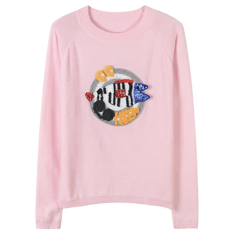 Women Sweater Animal Sequin Beading Fish Embroidery Jumper Color Block Jersey Long Sleeve Pullovers